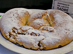 L’idea mi è venuta mentre ero in vacanza in Baviera, vedendo la forma del bretzel utilizzata praticamente in tutte le varianti, dolci e salate. Ho pensato allora di adattare la mia ricetta dello strudel con la pasta madre, arricchendola di una gustosa crema alla ricotta e realizzandolo a forma di bretzel.