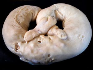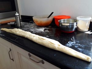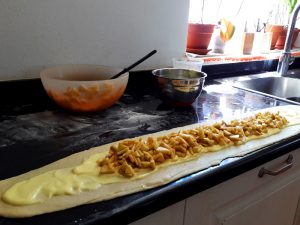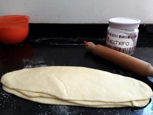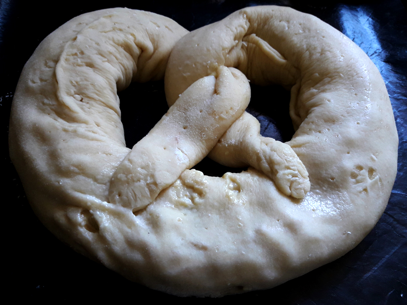 • creare la classica forma del bretzel, avendo cura di utilizzare per la parte centrale da incrociare le estremità di 10 cm che sono state stese più sottili e farcite solo con la crema; può essere utile aiutarsi con un tarocco grande per spostare il rotolo farcito senza romperlo;