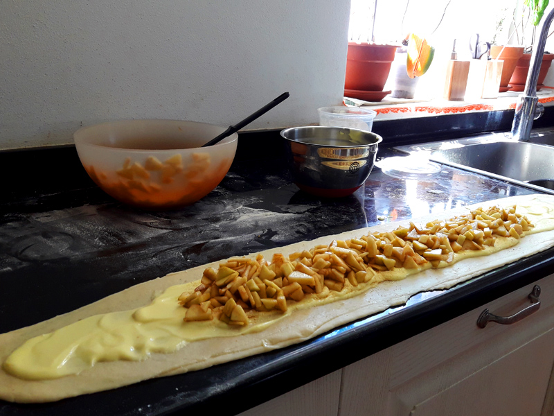 • strizzare bene le mele dal liquido che si sarà creato e stenderne uno strato abbondante nella parte centrale della sfoglia, sulla quale si è spolverizzato il pane grattugiato;