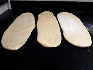 • dividere l’impasto in 3 palline di pari peso e stendere ognuna con il mattarello in un rettangolo di circa 40 cm x 10 cm;