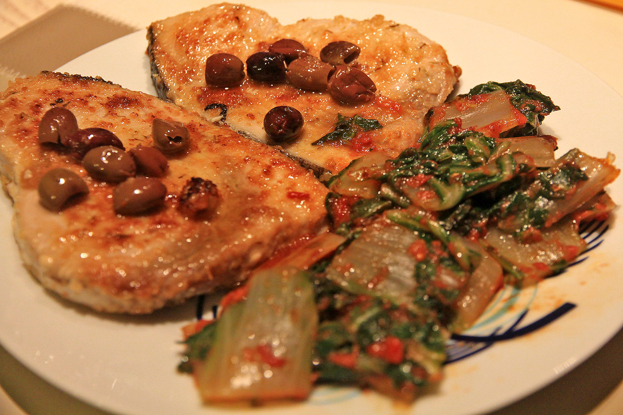 Stasera per cena ho preparato, a fantasia, pesce spada in padella e come contorno bietole, il tutto con le fantastiche olive taggiasche.