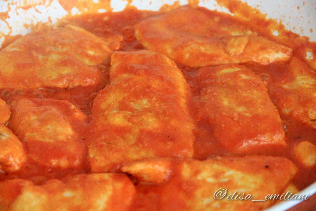 Si prendono un po’ di fettine di petto di pollo, ben battute perché siano di spessore omogeneo. In padella a fuoco vivace si mettono olio, aglio a pezzettoni e curry. Si fanno cuocere a fuoco vivo le fettine da entrambi i lati, poi si aggiunge la salsa di pomodoro allungata con un po’ di brodo. Verso fine cottura si procede alla salatura.