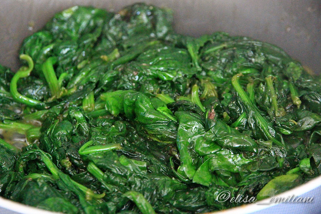 Nel frattempo, in una padella antiaderente tipo wok si mettono olio, aglio in polvere e la “magica” pasta di olive taggiasche. Quando è ben caldo, si mettono gli spinaci e si copre con il coperchio. Dopo poco, si rimescolano gli spinaci per farli cuocere omogeneamente. Verso fine cottura (piuttosto rapida) si aggiungono sale e pepe.
