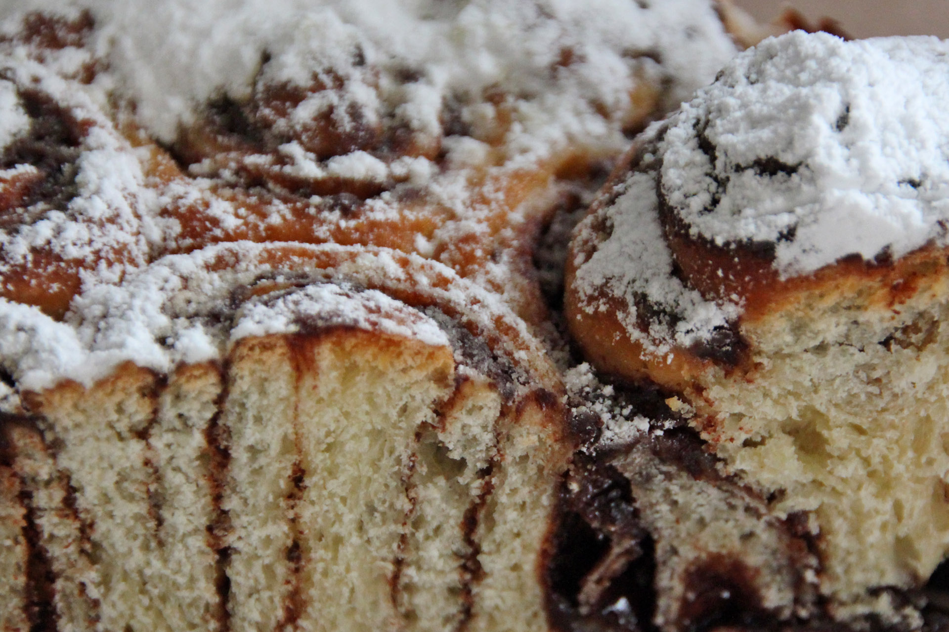 La sera stendiamo la pasta con l’aiuto di un mattarello, cercando di ricavare un rettangolo di 70 x 50 cm per poi tagliare delle strisce da 3 x 50 cm. Su ognuna di esse spalmiamo marmellata o nutella, a secondo dei nostri gusti. Arrotoliamo le strisce e componiamo la nostra torta nello stampo imburrato. Copriamo lo stampo con la pellicola e lasciamo lievitare tutta la notte a temperatura ambiente.